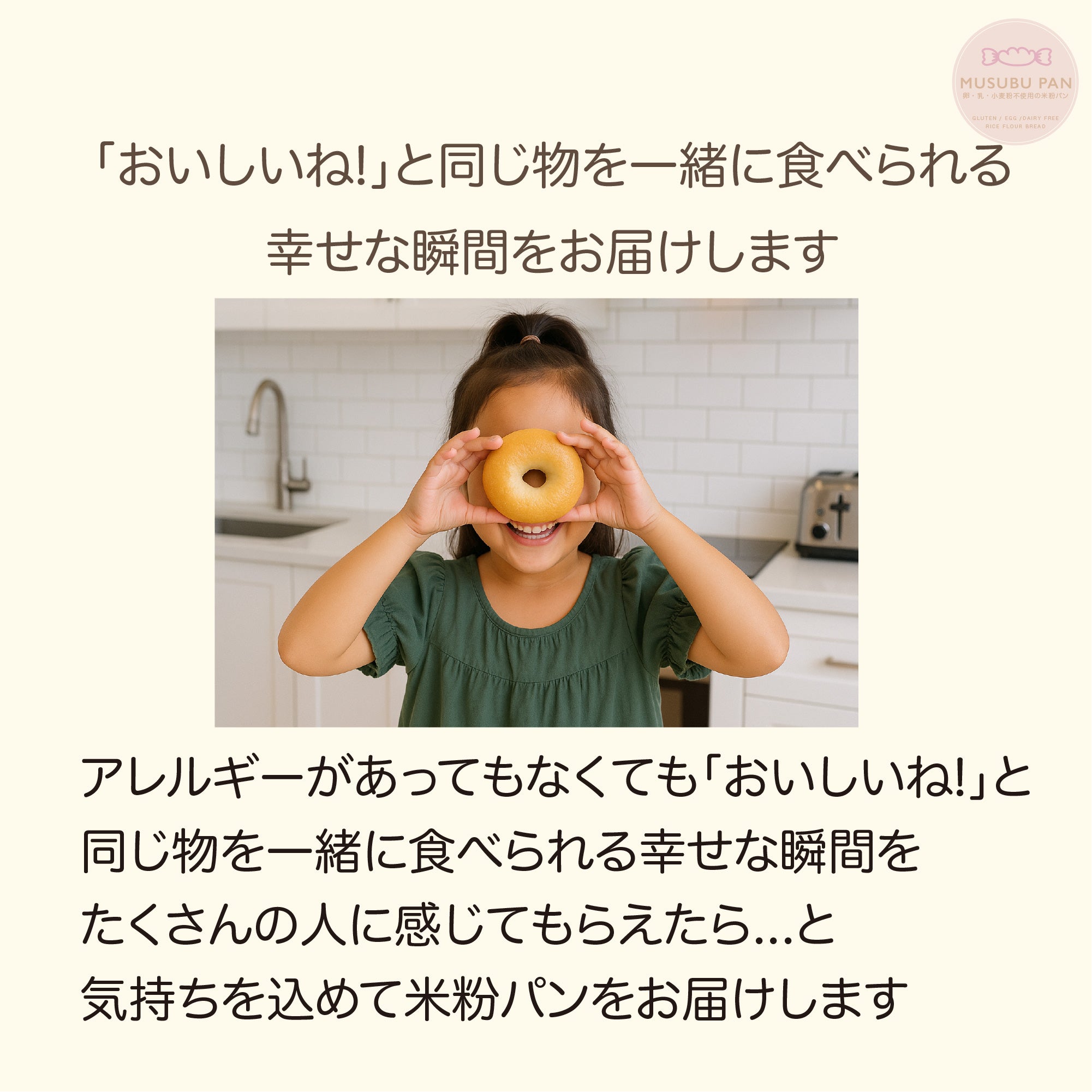 アレルギーがあってもなくても「おいしいね?」と同じ物を一緒に食べられる幸せな瞬間をたくさんの人に感じてもらえたら...と気持ちを込めて卵・乳・小麦不使用の米粉パンをお届けしています