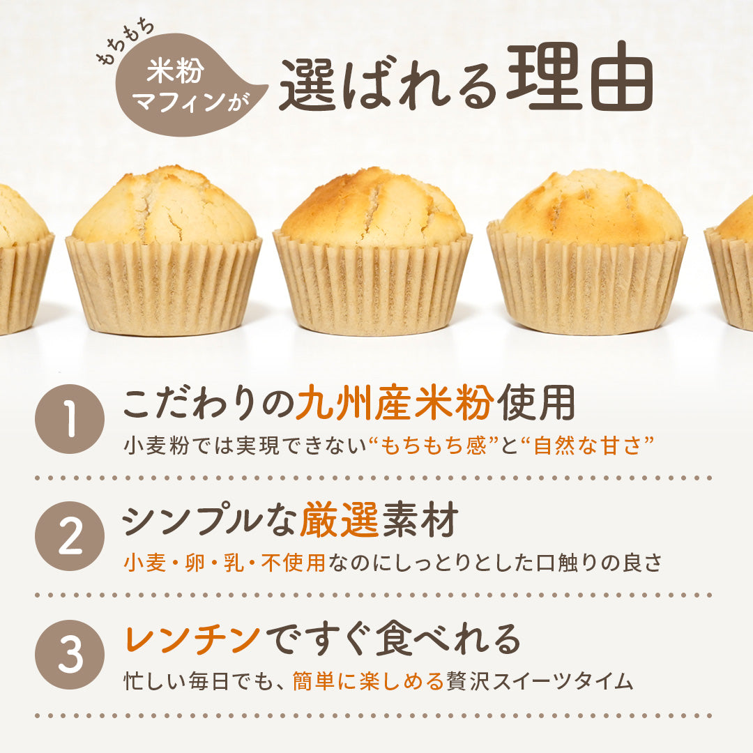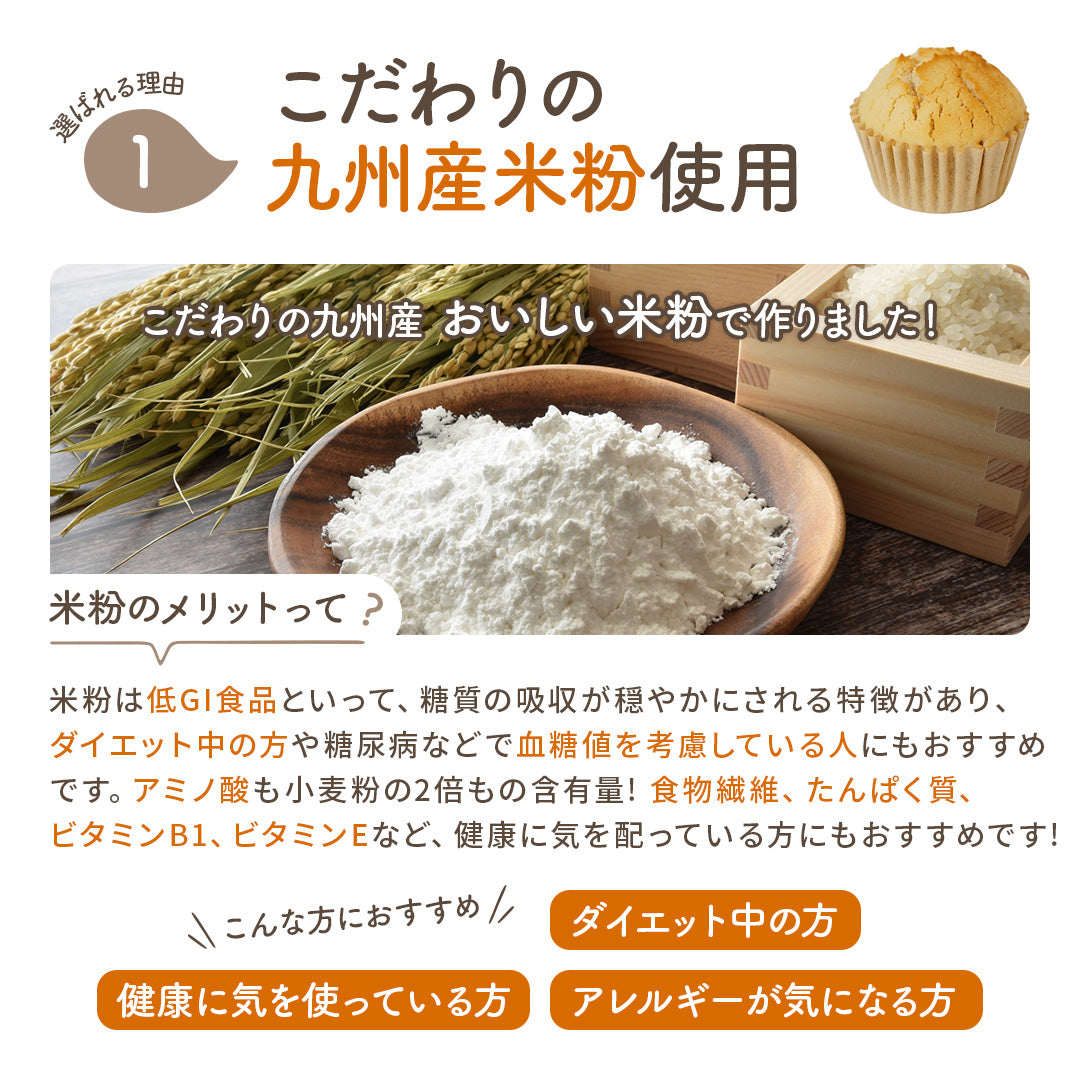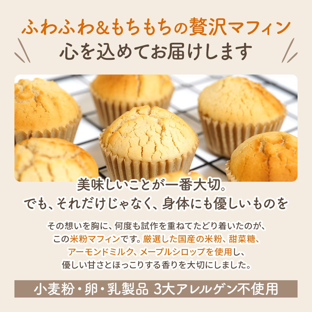 この米粉マフィンは、そんな悩みに寄り添うために生まれたスイーツです。小麦粉不使用のグルテンフリー、卵不使用・乳不使用で、体に優しい厳選素材を使い、安心して楽しめる米粉パン・米粉スイーツに仕上げました。