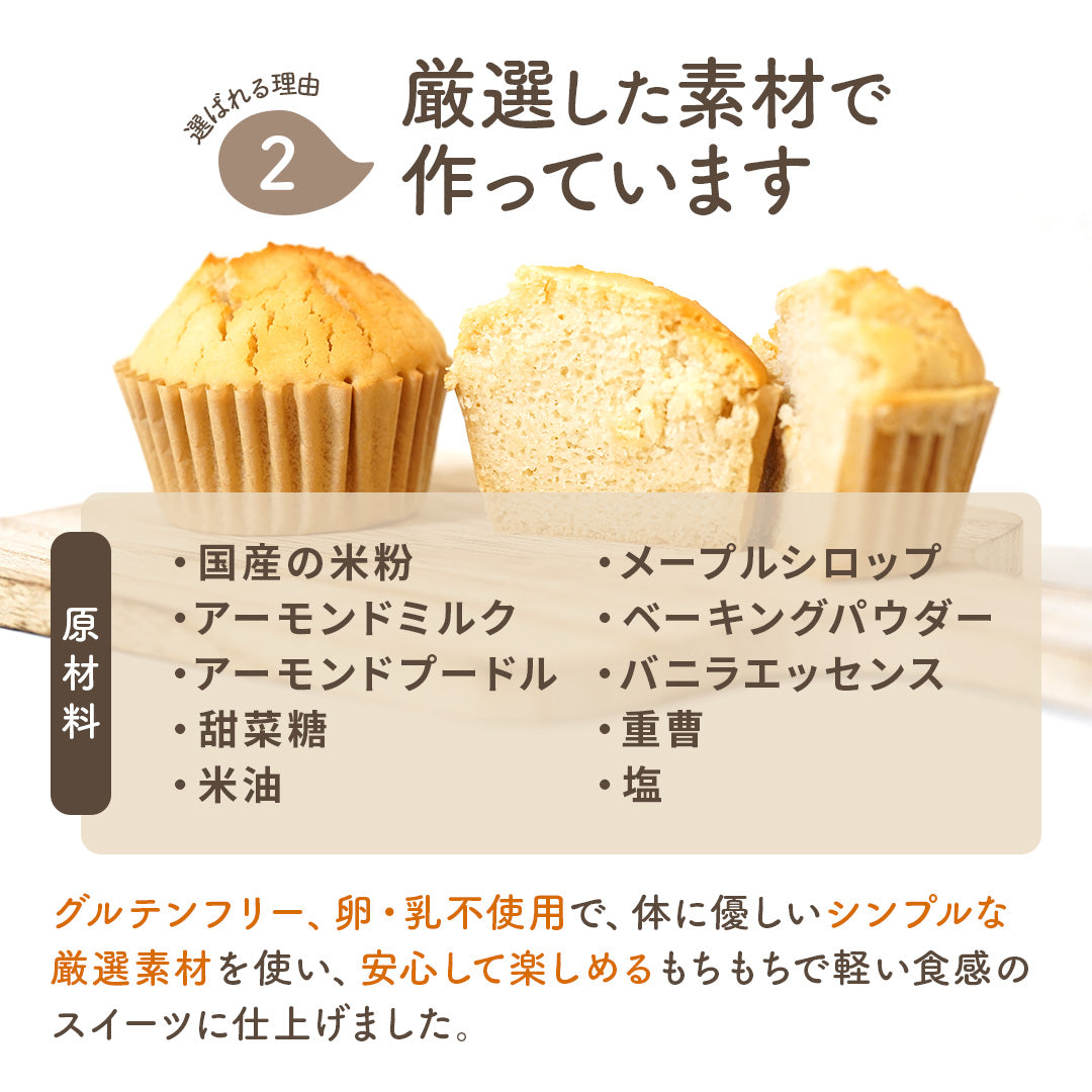 厳選した国産の米粉、甜菜糖、アーモンドミルク、メープルシロップを使用し、優しい甘さとほっこりする香りを大切にしました。しっとり&もちもち感にこだわったこのマフィンは、食べるたびに心が温かくなる、そんな贅沢なひとときをお届けします。